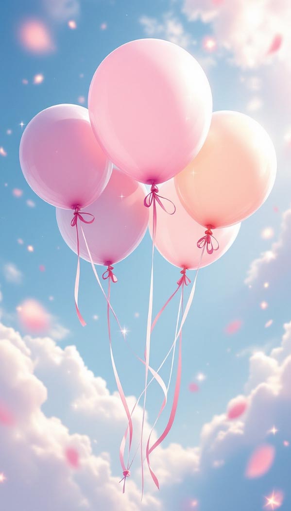 "Contra um céu azul sereno, balões cor-de-rosa flutuam graciosamente para cima, com suas formas delicadas refletindo a suave luz do dia. Nuvens finas criam um cenário de sonho enquanto fitas dançam na brisa suave. Brilhos de luz se espalham pelo cenário, adicionando um toque de magia a este momento de paz. Os balões sobrepostos criam uma sensação de profundidade, enquanto os tons pastéis pintam um quadro de pura tranquilidade e alegria."